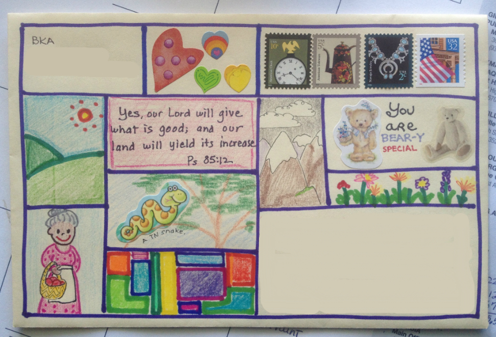 Psalm 85:12 July 22, 2015June 22, 2016 ~ Brenda Kay I hope my letters are fun to receive and that they may also brighten the day of a mail carrier along the way. Share this:Share Click to share on Pinterest (Opens in new window) Pinterest Click to print (Opens in new window) Print Click to email a link to a friend (Opens in new window) Email Click to share on WhatsApp (Opens in new window) WhatsApp Like Loading...