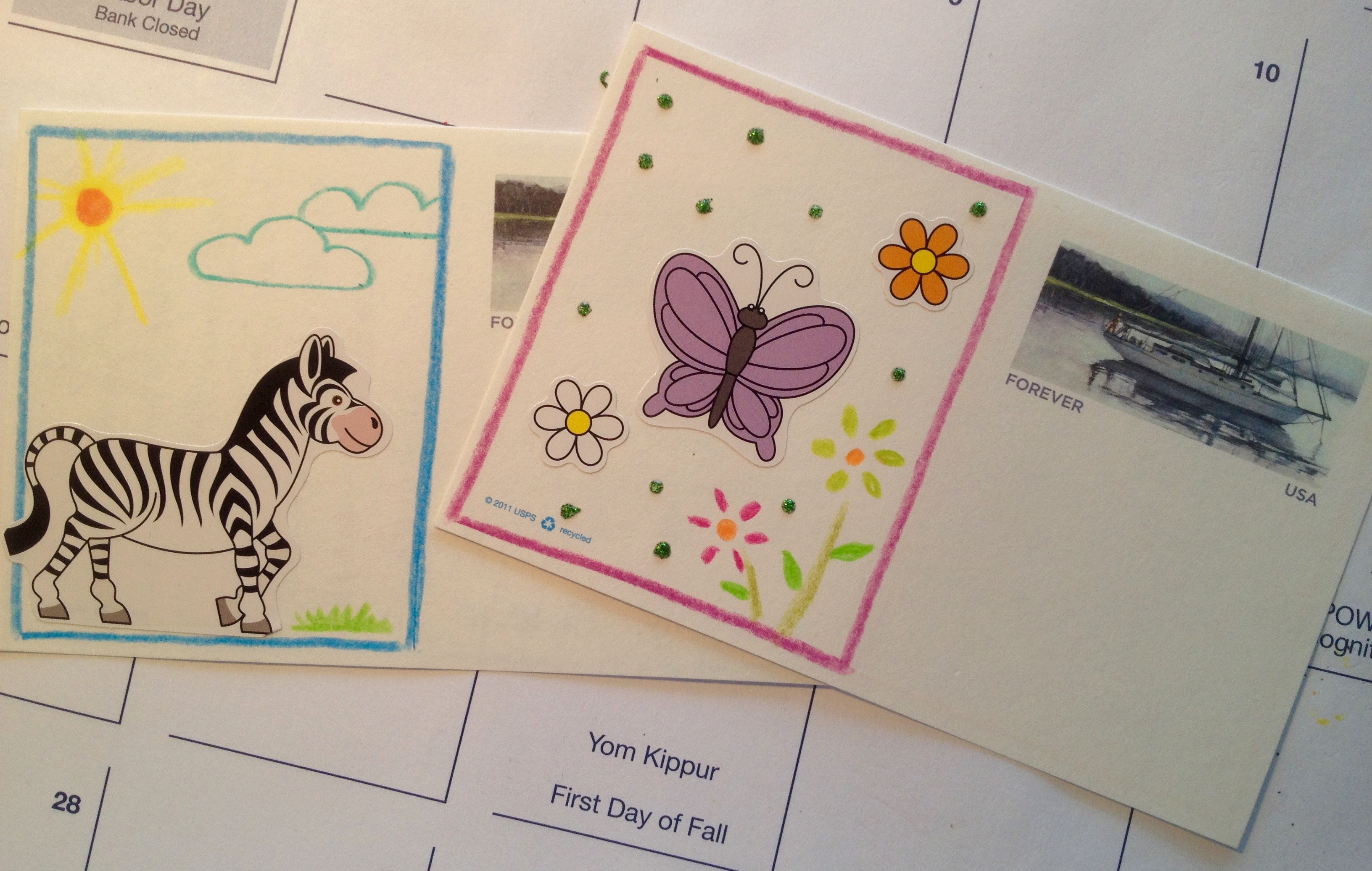 Postcards and Stickers October 1, 2015October 1, 2015 ~ Brenda Kay ~ Leave a comment The post office has pre-stamped postcards that make sending a note VERY easy. There are several stamp designs to choose from. Colored pencils and stickers make a plain card personal and fun to receive. (Markers will bleed through.) Share this:Share Click to share on Pinterest (Opens in new window) Pinterest Click to print (Opens in new window) Print Click to email a link to a friend (Opens in new window) Email Click to share on WhatsApp (Opens in new window) WhatsApp Like Loading...